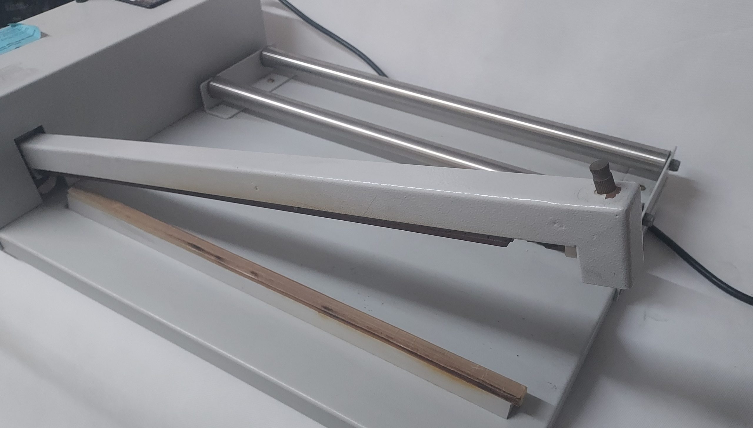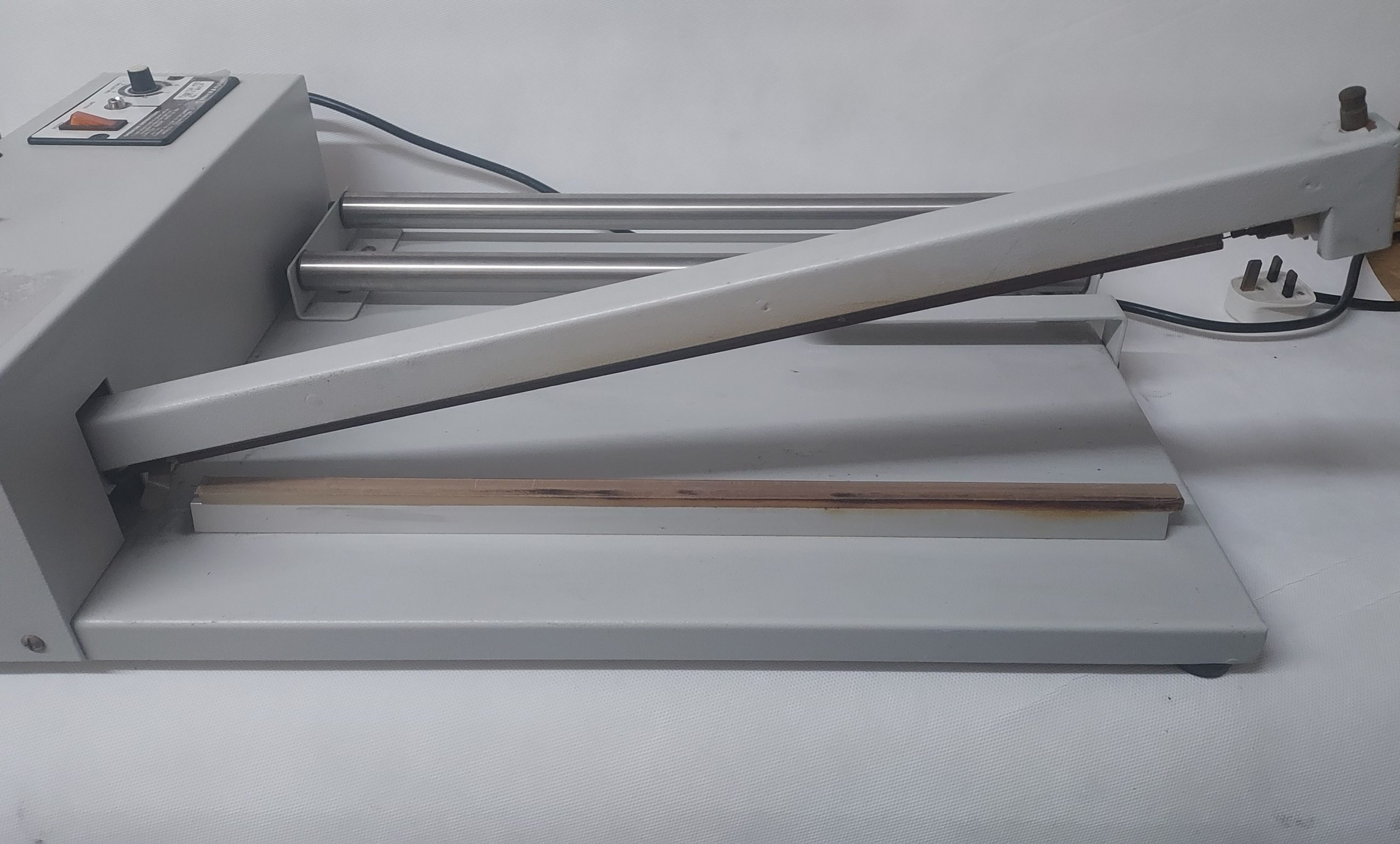 the machine has two film rollers that the roll of centrefold shrink film rolls smoothly across and a straight sealing bar that cuts and seals the heat shrink film.